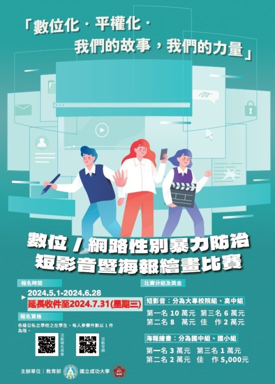 | 四、 | 因應本案比賽延長徵件時間至 113 年 7 月 31 日(星期三),檢附修正之簡章及海報電子檔各 1 份。 |