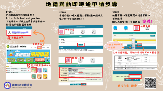 | (二) | 參加方式 :凡不動產位於桃園市之所有權人於活動期間成功透過內政部數位櫃臺(https://dc.moi.gov.tw)以自然人憑證申辦桃園市轄內不動產之地籍異動即時通服務, 並正確回答問卷並詳實填載個人資料即可參加抽獎活動,更多詳情請至本局官網(https://land.tycg.gov.tw/News_Content.aspx?n=3926&s=1288543)。 |